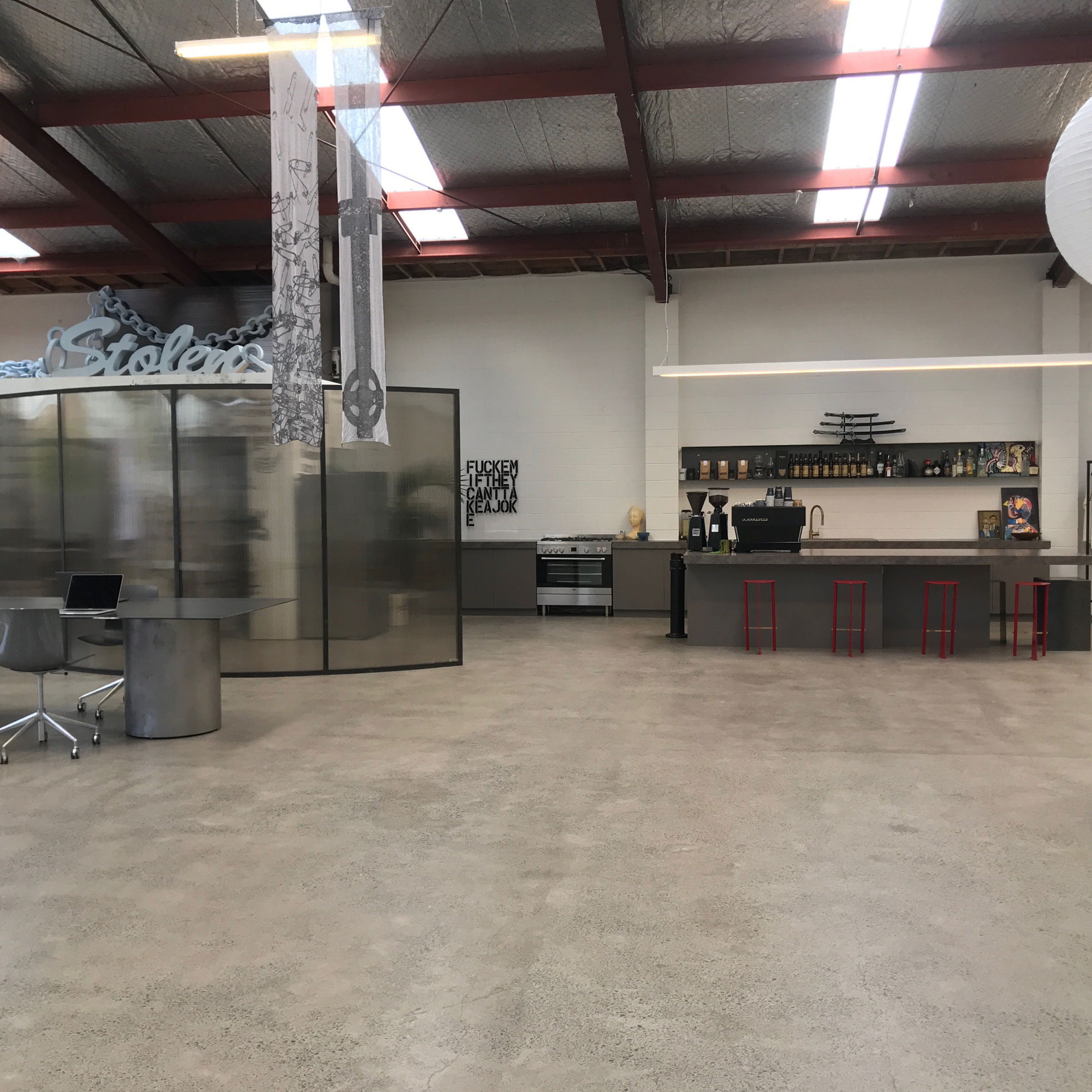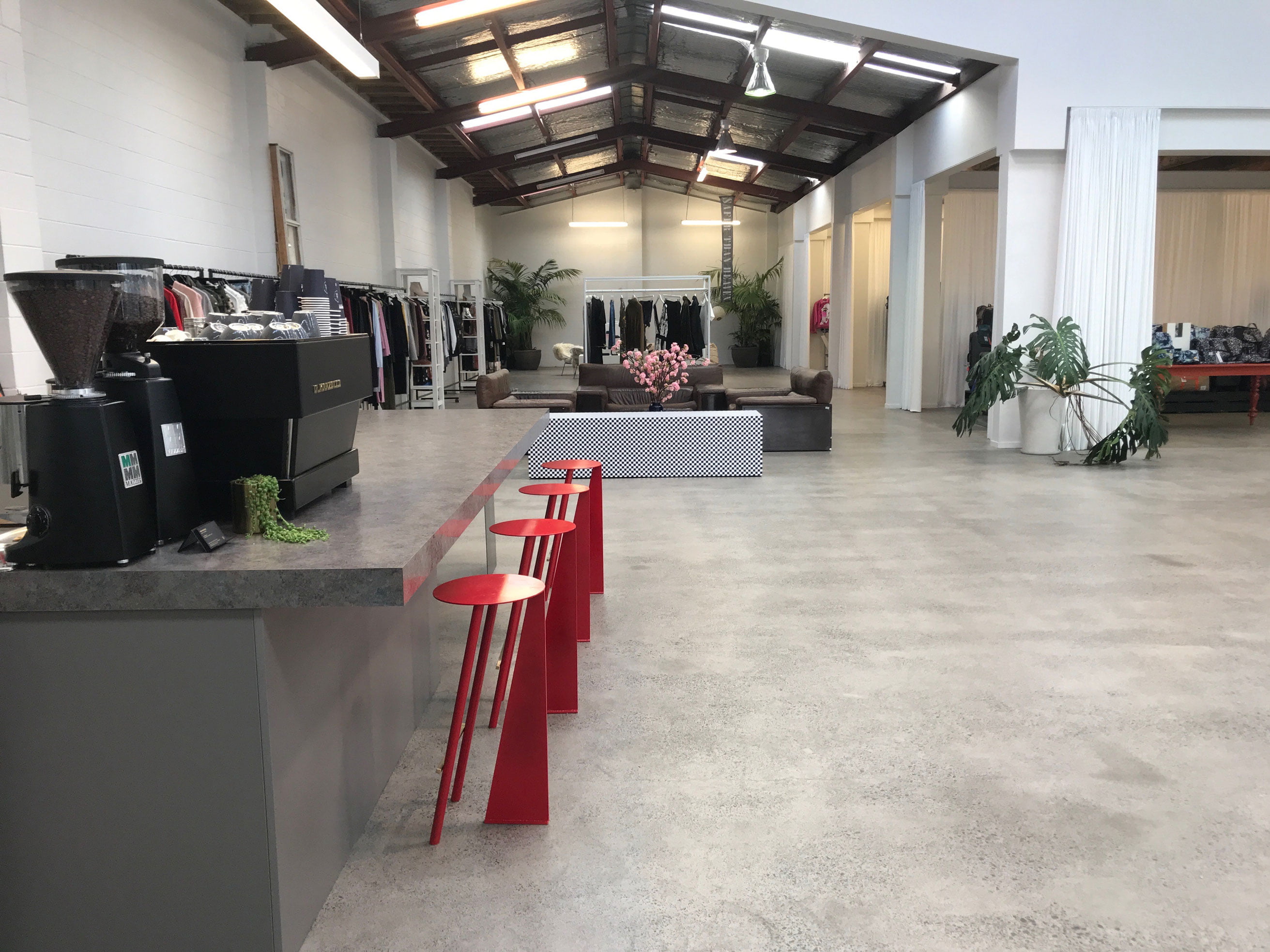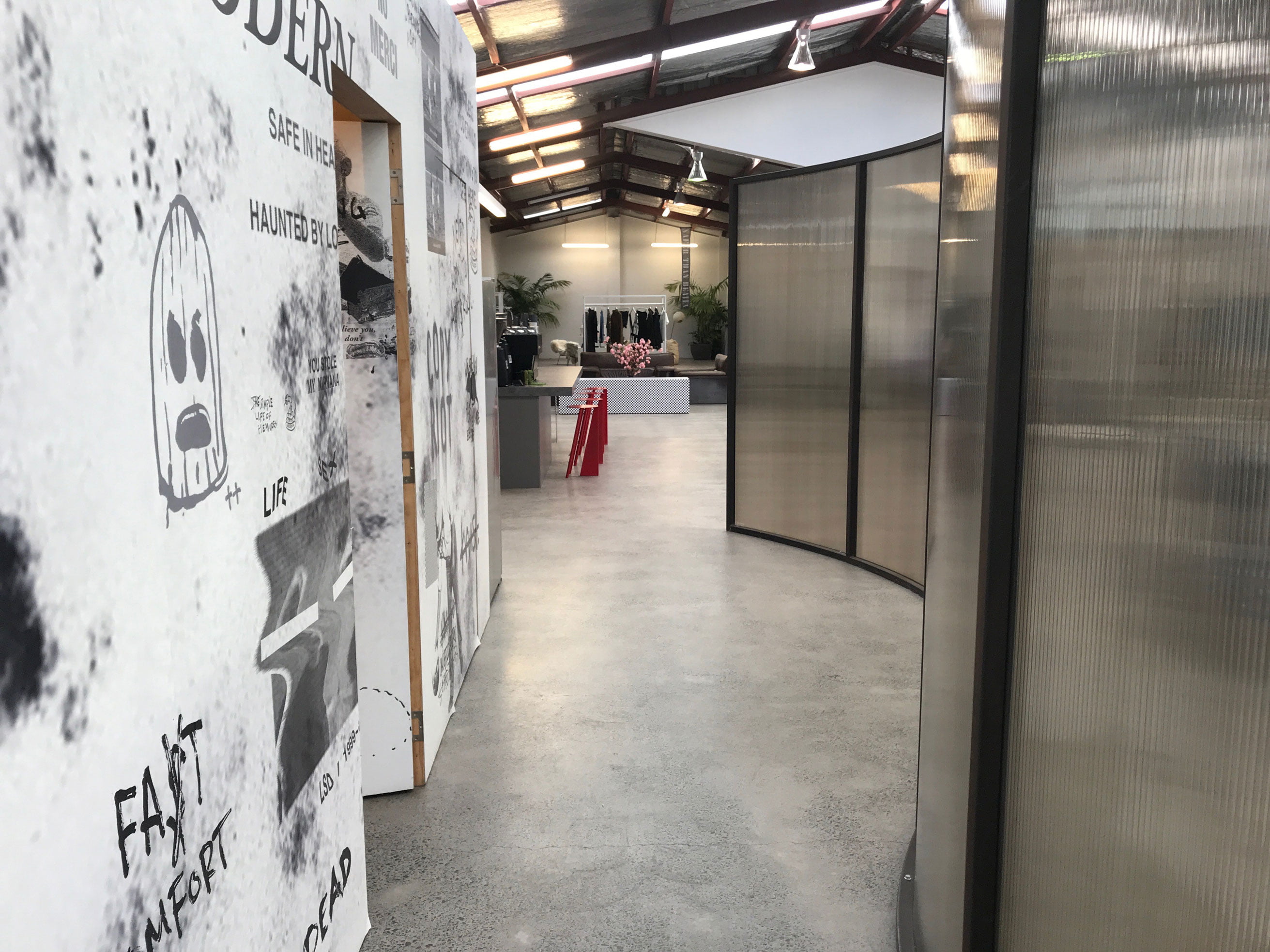 Curved showroom wall & stools